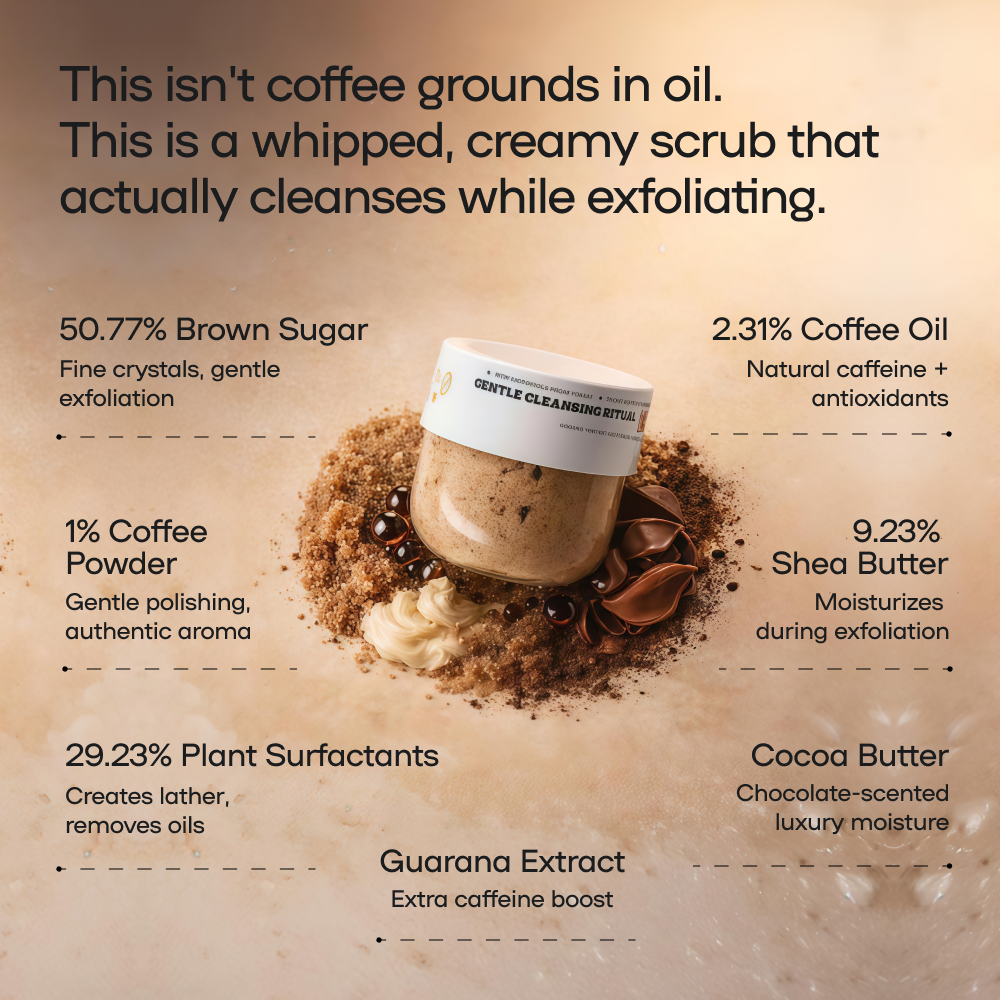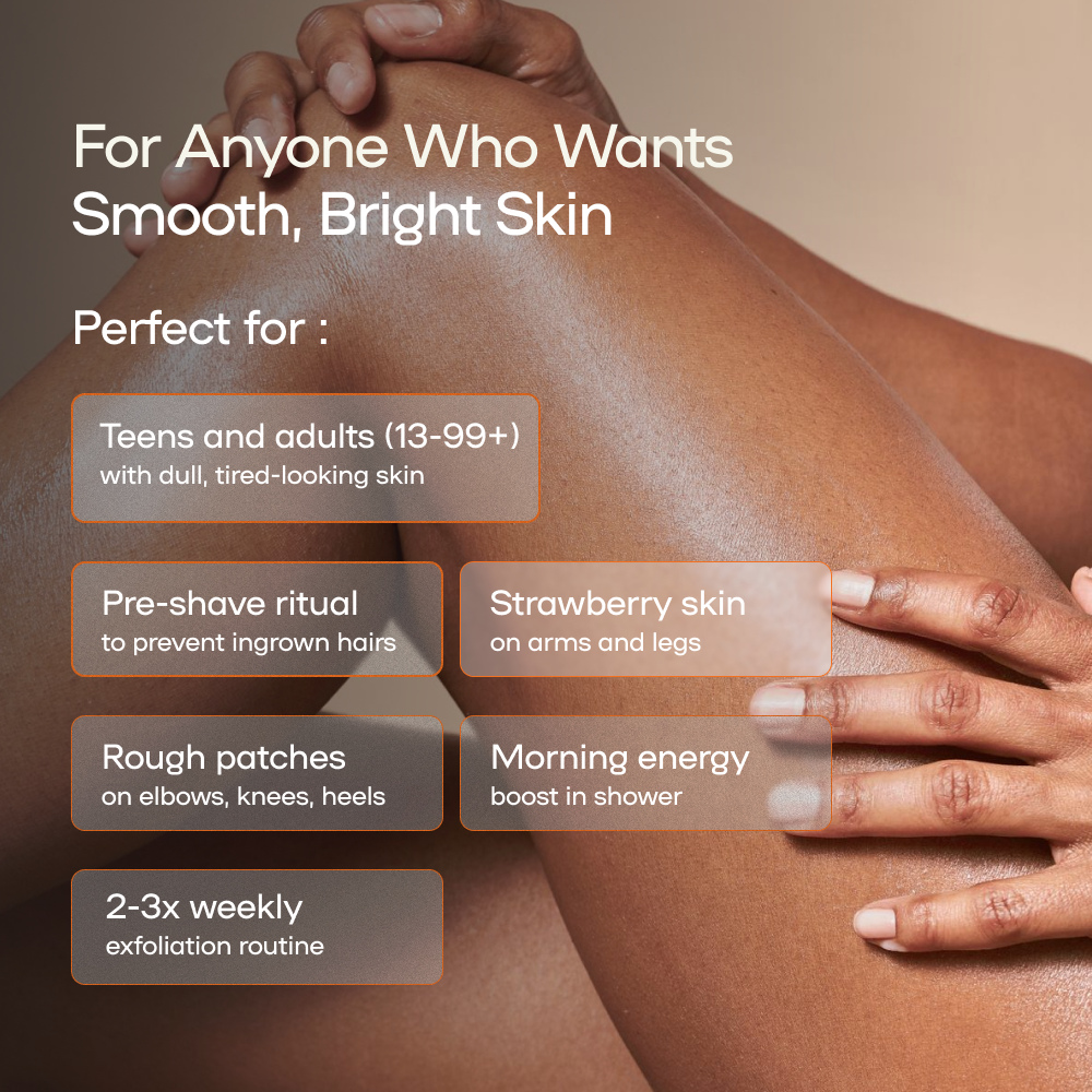 Targeted exfoliation and conditioning that smoothens rough skin and refreshes the body - without dryness or harsh scrubbing.